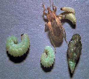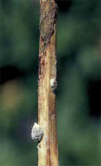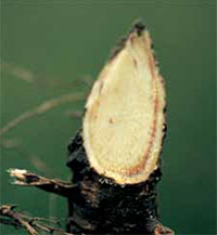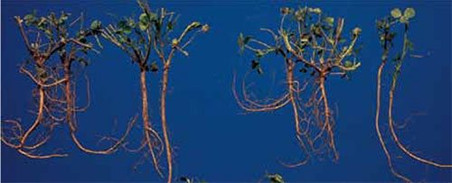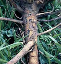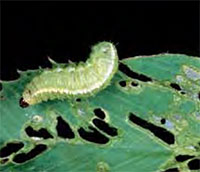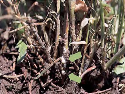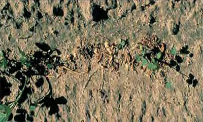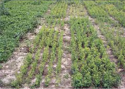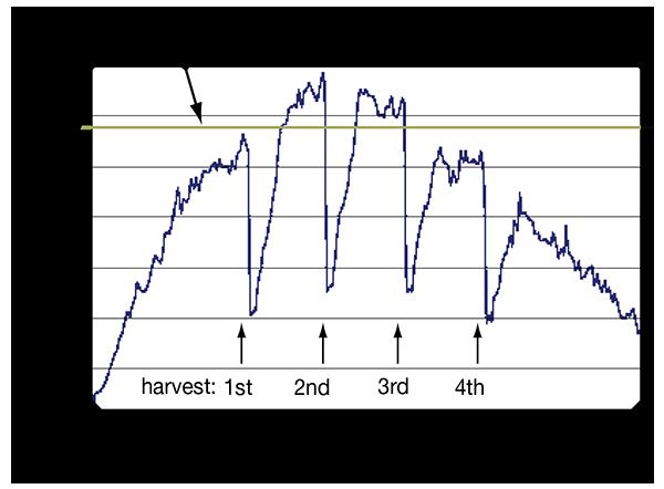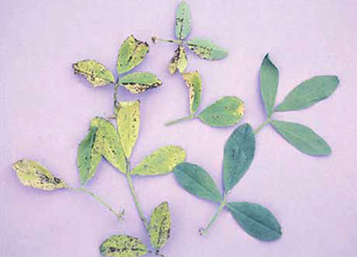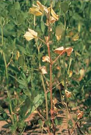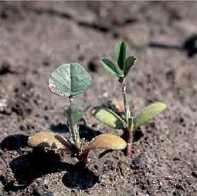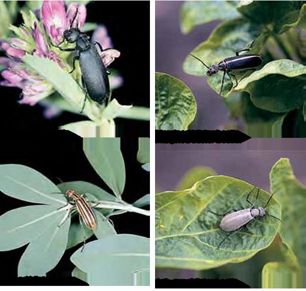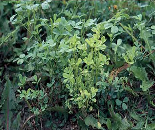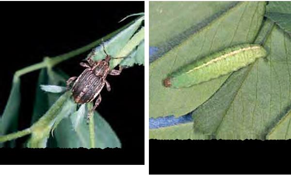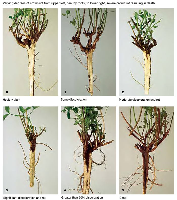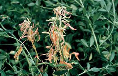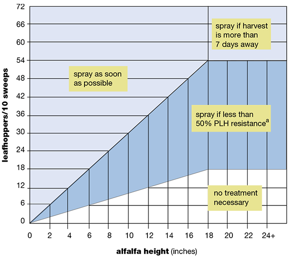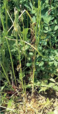 Production Once a good stand has been established, continued production and stand life depends on good management practices. Good management includes maintaining soil nutrients, applying manure judiciously, and controlling weeds and insects. Monitor diseases to estimate stand life and to determine resistance needed in future plantings. Finally, optimum production involves deciding when to rotate from stands that are no longer profitable. Fertilize annually Determine needs Alfalfa has a relatively high demand for some nutrients compared to other commonly grown crops. Each ton of alfalfa dry matter harvested removes about 14 pounds of phosphate (P2O5) and 58 pounds of potash (K2O). This is the nutrient equivalent of 150 pounds of a 0-10-40 fertilizer. Each ton of alfalfa also removes the calcium and magnesium found in about 100 pounds of aglime. See Table 4 for a complete list of nutrients removed. Since many of these nutrients are supplied from the native soil reserves, basing a fertility program on removals is not recommended. Soil tests are the most reliable method for preventing nutrient deficiencies. Visual symptoms (Table 6 and photos) can be used to help assess nutrient needs for future yield. However, by the time visual symptoms appear on a crop, nutrient deficiency may be so severe that significant yield losses have already occurred. Visual symptoms can also reflect environmental conditions, restricted root growth, diseases or other problems not related to a soil nutrient shortage. Table 4. Pounds of nutrient removed per ton of alfalfa produced, dry matter basis. Table 5. Sufficiency levels of nutrients, top 6 inches of alfalfa at first flower. Plant tissue analysis can determine the nutritional status of your crop before any visual symptoms appear. While this method does not measure nutrient amounts for making a fertilizer recommendation, combining tissue analysis with a soil test makes for a comprehensive nutrient management system. Advanced Techniques Tissue testing Tissue testing is very useful for assessing levels of sulfur and micronutrients. It can detect nutrient problems not easily detected with a standard soil test. Sample the top 6 inches of forage in bud to early flower stage in areas of the field that are free of other problems (insect, disease, drought, shade, etc.). Follow specific sampling and data interpretation guidelines to avoid misinterpretation. See Table 5 for a list of suggested sufficiency levels for the essential nutrients. Some have recommended sampling from baled hay for tissue mineral analysis. While this can be useful, results are more variable than sampling as described in the first paragraph. Most importantly, be sure to use different sufficiency ranges than for samples from top six inches of forage. Nitrogen Alfalfa typically gets enough nitrogen from its symbiotic relationship with nitrogen-fixing Rhizobium bacteria and from soil organic matter, which releases nitrogen as it decomposes. On well-inoculated, established stands, topdressed nitrogen does not improve yields, quality, or stand vigor. Normally, adding nitrogen may lower yield and/or quality by stimulating growth of grasses and weeds. But in some cases, such as where soils have not been adequately limed, an application of 30 to 50 lb/acre of nitrogen can be used as a stop-gap measure to increase yields. Phosphate and potash Alfalfa needs relatively large amounts of phosphate and potash. Adequate phosphorus is important for successful establishment and good root development. Potash is essential for maintaining yields, reducing susceptibility to certain diseases, and increasing winterhardiness and stand survival. In the eastern portion of the Midwest, potassium is likely the most limiting nutrient to alfalfa production. Phosphate and potash are relatively immobile when added to the soil. Phosphate bonds tightly on acidic clayey soils (pH < 5.5)="" and="" on="" very="" high="" ph="" soils="" (ph=""> 7.5) making it unavailable to plants. Potash can leach on some extremely sandy soils and on organic soils (peat or muck). Applications of phosphate and potash should be based on recommendations from a recent, well-calibrated soil test. Since alfalfa may take up more potassium than the plant needs, which creates animal health problems, do not topdress potash on soils testing very high for this nutrient. Forage tissue potassium levels should be monitored if luxury consumption of potassium is suspected. Alfalfa absorbs most nutrients, including phosphate and potash, from the top 6 to 8 inches of soil. However, because phosphorus is immobile, alfalfa responds better to incorporated applications than to topdressed applications. Guidelines for annual phosphate and potash application include the following: 1. Apply topdress nutrients immediately after harvest and before regrowth resumes. Avoid contact with wet foliage. 2. Topdress following first cutting to stimulate second and third cutting regrowth or in early September to increase winterhardiness. 3. Avoid application when soils are soft (such as early spring) when physical damage to the alfalfa crown is likely. 4. Split the application to avoid salt damage if more than 500 lb/acre of material (irrespective of grade) is to be used in any year. 5. Base fertilizer purchases on cost per unit of plant food provided and need for all nutrients contained in fertilizer. For example, since there is no difference in nutrient availability with red versus white potash or with ortho- versus polyphosphate on most soils, the best choice is the least expensive product. Potassiummagnesium sulfate may be a superior potassium source where sulfur is needed and not supplied from another fertilizer material. 6. Foliar application should not be used for applying moderate to high rates of macronutrients, although it is an excellent method for applying micronutrients. Advanced Techniques Managing high potassium testing field Excessive forage potassium levels in alfalfa (abov