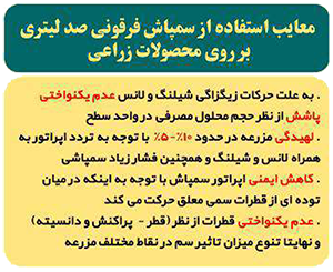همگان از آثار منفی مصرف سموم نباتی و عوارض زیست محیطی آن اطلاع دارند و به نقش موثر آفت کش های شیمیایی در مبارزه با آفات و اهمیت اقتصادی آن در تولید محصولات کشاورزی نیز اذعان دارند به این خاطر نه تنها از میزان تولید سموم گیاهی در جهان کاسته نشده بلکه همواره با تنوع بیشتر در حال توسعه است همگان از آثار منفی مصرف سموم نباتی و عوارض زیست محیطی آن اطلاع دارند و به نقش موثر آفت کش های شیمیایی در مبارزه با آفات و اهمیت اقتصادی آن در تولید محصولات کشاورزی نیز اذعان دارند به این خاطر نه تنها از میزان تولید سموم گیاهی در جهان کاسته نشده بلکه همواره با تنوع بیشتر در حال توسعه است محققان گیاه پزشکی مبارزه شیمیایی را به عنوان آخرین روش مبارزه با آفات مطرح می کنند ( البته در تلفیق با روش هایی مثل : زارعی ، مکانیکی ، فیزیکی و بیولوژیکی ). از حدود شصت سال پیش مصرف سموم شیمایی بر روی محصولات کشاورزی در ایران رایج شد به دنبال آن استفاده از انواع ادوات سمپاشی نیز توسعه یافت اما همواره اهمیت آموزش شیوه های صحیح کاربرد سمپاش ها در حاشیه تبلیغات فروش آنها پنهان و یا کمرنگ مانده است در حال حاضر حدود 30 تا 50 درصد سموم مصرفی در کشور به علت کابرد نامناسب سمپاش ها به هدر می رود. اصول کلی سمپاشی سموم نباتی ممکن است به چند صورت مورد استفاده قرار گیرند : به صورت تقریبا خالص ( که به تکنیکال معروف است ) با استفاده از یک حلال که معمولا آب است و به عنوان امولسیون ارائه می شود به صورت گردپاشی به صورت گرانول پاشی این سموم ، در یک برنامه سمپاشی باید به طور یکنواخت و همگن بر روی گیاه ( و یا سایر اهداف مورد نظر ) پاشیده شوند وسیله مناسب برای شکستن محلول و تبدیل آن به قطره سمی دستگاه سمپاش است. اجرای اصلی یک سمپاش ، بسته به نوع آن معمولا شامل : مخزن ، لوله ها ، اتصالات ، پمپ ها ، توربین های تولید جریان شدید هوا ، موتورهای الکتریکی ، نازل ها ، صافی ها و بوم ها است. آنچه که در تولید قطرات سمی از اهمیت بیشتری برخوردار است ، توجه به مشخصات قطره است مشخصاتی که باید متناسب با اهداف مورد نظر در سمپاشی باشد مثل : ارزیابی قطر قطرات در واحد سطح و همچنین چگونگی پراکنش تصویر زیر به خوبی نشان می دهد که توجه به مشخصات یاد شده و رابطه بین قطر و تعداد آن ، متناسب با هدف مورد نظر ، تا چه میزان می تواند کار آیی عملیات سمپاشی را افزایش دهد. اندازه قطر قطرات سمی برحسب ( میکرون ) محاسبه می شود برای این منظور از کارت های حساس به آب و یا روغن استفاده می شود به این صورت که هنگام کار تعدادی از این کارت ها را به فاصله های معین و متعدد در زیر دستگاه سمپاش قرار می دهند پس از ظهور لکه های ریز و آبی رنگ ، با استفاده از دستگاه ویژه ( اپتوماکس ) و یا مقایسه با کارت های شاخص ، سه مشخصه مذکور شامل : قطر ، تعداد و پراکنش قطرات را ارزیابی می کنند به این ترتیب ، به تناسب هدف مورد نظر ، تکنیک های سمپاشی اصلاح می شود. شناسایی نازل های سمپاش یکی از مهم ترین اجزای سمپاش ها که نقش موثری در کیفیت و ویژگی های قطرات تولید شده دارد (( نازل )) است نازل ها دارای انواع و نام های متفاوت و متنوعی هستند . اما به طور کلی دارای دو شاخه اصلی اند. 1. نازل های مخروط پاش صرفا کاربری آنها با هدف (( حشره کش پاشی )) و یا (( قارچ کش پاشی )) است و برای علفکش پاشی )) توصیه نمی شوند البته این نوع نازل ها گاه به صورت مخروط توپر و گاه با استفاده از یک ابزار نصب شده در پشت آن به صورت مخروط تو خالی که بیشترین کاربرد را دارد به کار می روند. 2. نازل های باد بزنی به نازل های تی جت نیز معروفند و صرفا با هدف علفکش پاشی به کار می روند. البته در مواقعی که صرفا سمپاش لانس دار ( با نازل مخروط پاش ) در اختیار داریم و ناگزیر از علفکش پاشی می باشیم نازل شره ای می تواند نقش مبدل را ایفا کند بدین صورت که نازل مخروط پاش از سر لانس باز و به جای آن نازل شره ای نصب می شود به این ترتیب خروجی نازل از حالت مخروط پاشی به حالت بادبزنی مشابه نازل های تی جت تغییر وضعی
